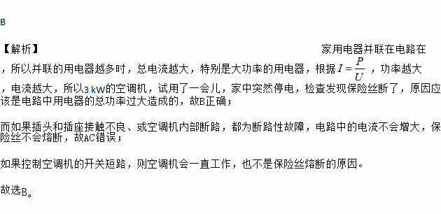 暑假,徐延同学家新装了一台3 kW的空调机,试用了一会儿,家中突然停电,检查发现保险丝断了,导致上述故障的原因可能是( )