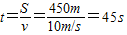 解答:解:已知v=36km/h=10m/s,S=450m