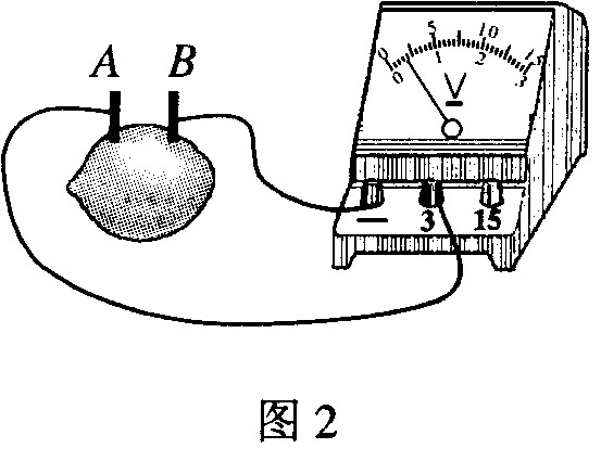 把两种不同的金属片插入柠檬,制成“水果电池”.用电压表测量水果电池的电压,如图2所示.下列说法正确的是