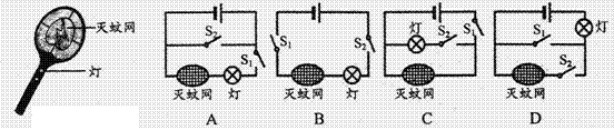 如图所示的电蚊拍,具有灭蚊和照明等功能。当开关Sl闭合、S2断开时,只有灭蚊网通电起到灭蚊作用;当开关Sl和S2都闭合时,灭蚊网与灯都通电同时起到灭蚊和照明作用。下列电路设计符合这种要求的是![]()