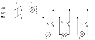 电工师傅常用一只标有“220V 40W”的灯泡L0(检验灯泡)取代保险丝来检查新安的照明电路中每个支路的情况,如图所示。当只闭合S、S1时,L0不亮;当只闭合S、S2时,L0和L2都呈暗红色;当只闭合S、S3时,L0正常发光。由此可以判断 ( )