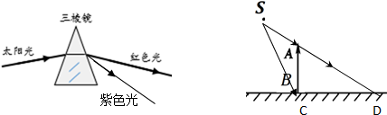 解答 解:(1)太阳光经过三棱镜折射后可以分散成七种颜色的光,从上而下分别是红、橙、黄、绿、蓝、靛、紫,