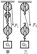 如图所示,分别用甲、乙两个滑轮组提起重力G1=G2的重物至相同的高度h,若所用拉力F1=F2,已知甲的机械效率50%,则(不计绳重及摩擦)( )