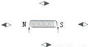 解答:解:电流从螺线管的左端进入,从右端流出,根据安培定则判断,螺线管的左端是N极,右端是S极;根据同名磁极相互排斥,异名磁极相互吸引,螺线管周围的磁极如图.