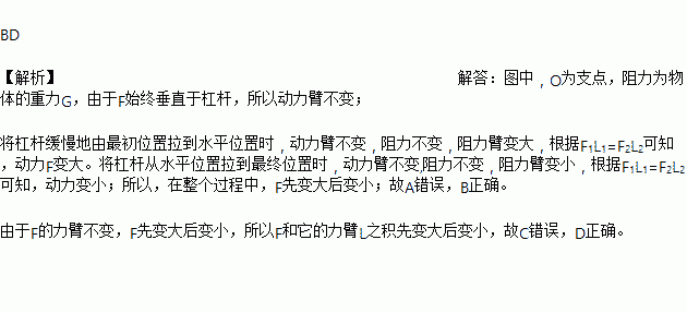 如图所示,轻质细杆可绕O点自由转动,在A端施加一个始终垂直于杠杆的作用力F,使其从OA位置慢慢地转到OA′位置的过程中,以下正确选项是( )