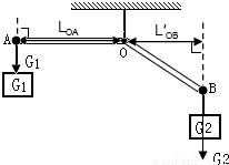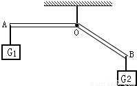 【答案】分析:从题知,OA处于水平位置,GA对杠杆的拉力为竖直向下,所以G1对杠杆拉力的力臂即为杠杆AO的长度,G2对杠杆拉力的方向也是竖直向下,但OB不是处于水平,所以GB对杠杆拉力的力臂OB′小于OB的长度,根据杠杆的平衡条件分析,即可得出两个物体重力的大小.
