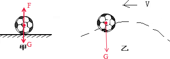 乙图中,将球踢出后,足球因为惯性会继续向前运动,若不计空气阻力,足球只受到重力的作用.过足球重心,沿竖直向下的方向画一条有向线段,用G表示,如图所示:![]()