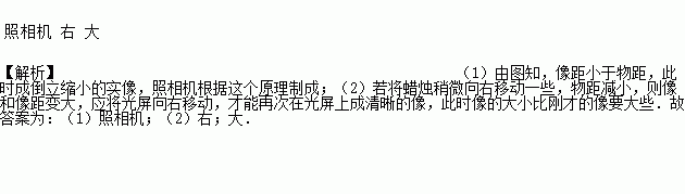 ②若将蜡烛稍微向右移动一些,则应将光屏向_________移动(选填“左”或“右”)才能再次在光屏上成清晰的像,此时像的大小比刚才的像要___________些(选填“大”或“小”)。