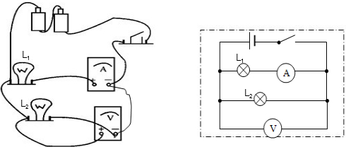 (2)按电流流向法,先画出电源,从电源的正极出发依次画出开关、灯泡L1、灯泡L2、电流表回到电源的负极,然后把电压表并联在灯泡L1的两端,如下图所示: