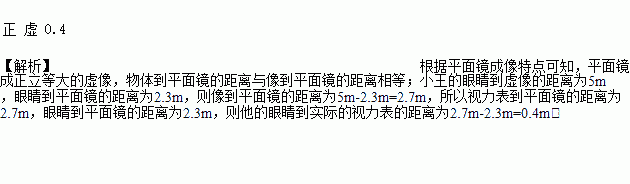 在检查视力时,医生让小王观察前方平面镜中的视力表来确定视力。实际上,视力表在小王的后方,他在镜中看到的是视力表____立、等大的____像。若小王的眼睛到虚像的距离为5m ,眼睛到平面镜的距离为2.3m ,则他的眼睛到实际的视力表的距离为____m。