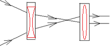 通过第一个透镜的光线比起入射光线更加远离主光轴,所以该透镜对光线有发散作用,因此填凹透镜.