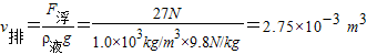 根据阿基米德原理:Fgv=1.0×103kg/m3×9.8N/kg×3×10-3m3=29.4N>27N,