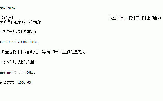研究表明:物体在月球上的重力大约是它在地球上重力的1/6.一个物体在地球上的重力是600N,若把它放在月球上,它的重力是______N,质量是______kg.(g=10N/kg)