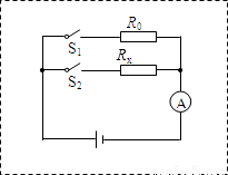 为测量电阻Rx的阻值,老师提供了以下器材:待测电阻Rx、已知阻值的定值电阻R0一个、电压不变但电压值未知的电源一个、电流表一只、开关两个、导线若干。从中选择器材按下述要求完成实验。