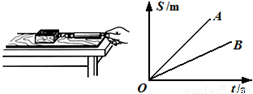 如图所示,用弹簧测力计拉着木块,沿水平方向匀速运动.两次拉动同一木块得到距离随时间变化的图线A、B.下列说法正确的是( )