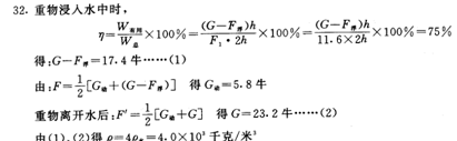 为11.6牛,滑轮组的机械效率为75%,当重物离开水面时,拉力为14.5牛(整个装置的摩擦和绳重不计),求重物的密度。