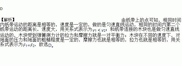如图所示,A是一个能上下周期性振动并在纸带上每隔相等时间打下一个点的装置.放在水平桌面上的木块,左端与轻纸带相连,通过弹簧测力计水平拉着木块向右匀速运动,A装置在纸带上打下一系列的点.图中①和②是先后打出的两条纸带,与其对应的测力计的示数分别为F1、F2,木块运动的速度分别为v1、v2,那么( )