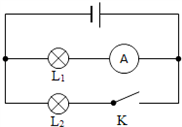 如图所示的电路中,有一根导线尚未连接,请用笔画线代替导线补上,要求:当电键K闭合时,两灯都发光,且电流表的示数不变.连接后,在方框内画出电路图.