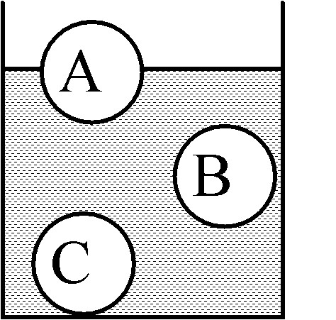 三个体积相同而材料不同的球A、B、C,分别静止在不同深度的水里,以下说法正确的是: