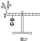 用弹簧秤竖直向上拉杠杆一端的A点,如图27中a所示,杠杆平衡时,弹簧秤示数为Fa,凡若在A点斜向上拉,如图27中b所示,杠杆平衡时,弹簧秤示数为Fb,则Fa______Fb。(选:大于、小于、等于填)