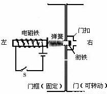 某宿舍楼一单元的几家住户为增强安全感.在单元楼梯口安装了防盗门.图所示为单元防盗门门锁的原理图.各家住户都安有一个控制开关S,用来控制门锁,图中只画出了其中一家住户的控制开关.该门锁的工作过程是:楼上的人闭合控制开关S.门锁上通电后的电磁铁吸引卡入右侧门上门扣中的衔铁,衔铁脱离门扣,门可打开.关于该门锁.下列说法中正确的是