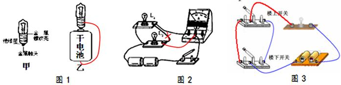 (1)要使灯泡发光,将电源的正负极分别与小灯泡的金属触头与金属螺纹相连构成通路即可,如图所示: