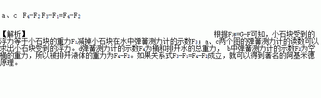 小芳同学在探究“浮力的大小等于什么”时,用弹簧测力计 、小石块、烧杯、小桶等进行实验操作,如图所示a、b、c、d是四个步骤示意图。设四个图中弹簧测力计的读数分别是F1、F2、F3、F4,由四个图中__________两个图的弹簧测力计的读数可以求出小石块受到的浮力;被排开液体的重力为__________;如果关系式__________成立,就可以得到著名的阿基米德原理。
