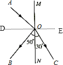 解答 解:过入射点O做出法线DE,由图可知:入射光线和折射光线应该在同一种介质中,所以MN左侧的两条光线为入射光线和折射光线;![]()