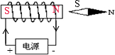 根据螺线管的N、S极和螺线管的线圈绕向.利用安培定则可以确定电流是从螺线管的左端流入右端流出.由于电流是从电源的正极流出,经过外电路回到电源负极.所以可以确定电源的左端为正极,右端为负极.如图所示:![]()