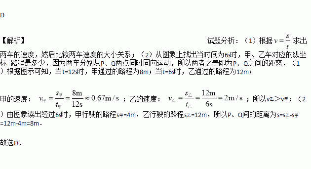 甲、乙两车在公路上,分别从P、Q两点同时同向运动,它们s﹣t图象的(路程﹣时间图象)如图所示,经过4s甲、乙相遇.甲、乙的速度分别为v甲、v乙,P、Q间的距离为s,则( )