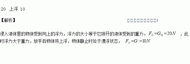 一个物体所受的重力为10N,将其全部浸没在水中时,它所排开的水所受的重力为20N,此时它所受的浮力为___________N,放手后物体将___________(填“上浮”、“下沉”或“悬浮”),物体静止时所受浮力为___________N。