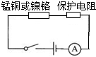 (3)比较锰铜、镍铬两种合金丝的导电性能,根据I=$\frac{U}{R}$电路中电阻大,电流小,所以可以将合金丝与电流表、一个定值电阻串联在电路中,实现目的,