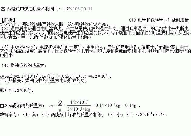 (4)已知实验中乙烧瓶内煤油质量为200g,煤油温度升高了10℃,不计热损失,则可知,电流通过保险丝所做的功为_____J。这相当于完全燃烧_____g酒精所放出的热量。【c煤油=2.1×103 J/(kg·℃),q酒精=3×107J/kg】