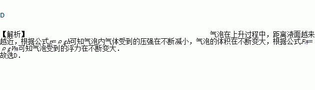 如图所示,小鱼在水中吐出气泡,在气泡升至水面的过程中,体积会逐渐变大。下列关于气泡受到的浮力和气泡内气体的压强变化情况的描述中,正确的是: ( )