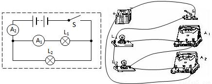 现有电源、开关各一个,灯泡L1和L2,电流表A1和A2,导线若干.请按要求在方框内画出电路图. 要求: