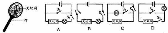 如图所示的电蚊拍,具有灭蚊和照明等功能。当开关Sl闭合、S2断开时,只有灭蚊网通电起到灭蚊作用;当开关Sl和S2都闭合时,灭蚊网与灯都通电同时起到灭蚊和照明作用。下列电路设计符合这种要求的是![]()