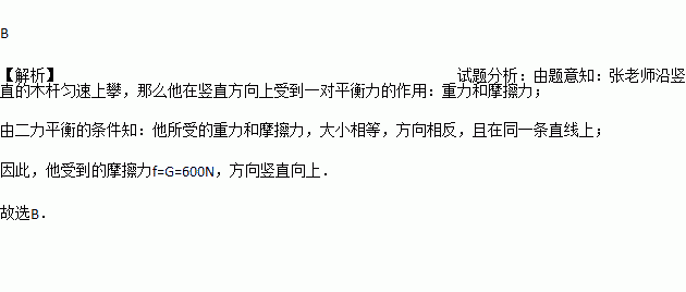 学校趣味运动会上,体重为600N的张老师沿竖直木杆匀速向上攀爬,此过程中,他受到摩擦力的大小和方向是( )