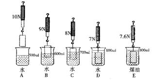 小明同学用一个弹簧测力计、一个金属块、两个相同的烧杯(分别装有一定量的水和煤油),对浸在液体中的物体所受的浮力进行了研究,下图表示探究过程及有关数据。