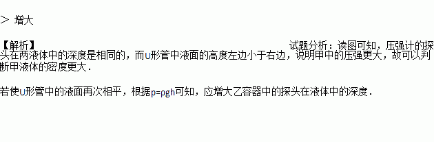 ΪÁËÑо¿ÒºÌåÄÚ²¿Ñ¹Ç¿µÄÌØµã£¬Ð¡¸Õ½«ÒºÌåѹǿ¼Æ½øÐÐÁ˸Ľø£®µ±Á½Ì½Í·ÖÃÓÚ¿ÕÆøÖÐʱ£¬UÐιÜÒºÃæÏàÆ½£®ÏÖ½«Á½Ì½Í··Ö±ð·ÅÔڼס¢ÒÒÈÝÆ÷ÄÚÃܶÈΪ¦Ñ1ºÍ¦Ñ2µÄÁ½ÖÖÒºÌåÖУ¬ÇÒÁ½Ì½Í·Ëù´¦µÄÉî¶ÈÏàͬʱ£¬UÐιÜÖеÄÒºÃæÎ»ÖÃÈçͼËùʾ£¬Ôò¦Ñ1 ¦Ñ2£¨Ñ¡Ìî ¡°>¡±¡°<¡±»ò¡°=¡±£©£»ÈôʹUÐιÜÖеÄÒºÃæÔÙ´ÎÏàÆ½£¬Ó¦ £¨Ñ¡Ìî ¡°Ôö´ó¡±»ò ¡°¼õС¡±£©ÒÒÈÝÆ÷ÖеÄ̽ͷÔÚÒºÌåÖеÄÉî¶È£®