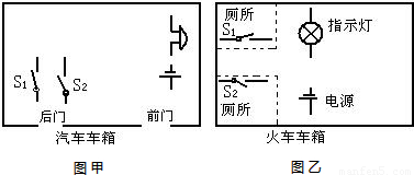 £¨2£©»ð³µµÄ³µÏáºóÃæÓÐÁ½¼ä²ÞËù£¬Ö»Óе±Á½¼ä²ÞËùµÄÃŶ¼¹ØÉÏʱ£¨Ã¿ÉÈÃŵIJåÏúÏ൱ÓÚÒ»¸ö¿ª¹Ø£©£¬³µÏáÖеÄÖ¸Ê¾ÅÆÄÚµÄָʾµÆ²Å»á·¢¹â£¬Ö¸Ê¾ÅƾͻáÏÔʾ¡°²ÞËùÓÐÈË¡±×ÖÑù£¬ÈçͼÒÒËùʾ£¬ÌáÐÑÂÿÍÁ½¼ä²ÞËùÄÚ¶¼ÓÐÈË£®