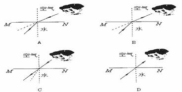 小红在家做了这样一个实验:把一枚硬币放在一个没有盛水的碗底,把碗放在桌子上并慢慢向远处推移,直到眼睛刚好看不到为止。保持头部不动,缓缓地向碗中倒水,倒着、倒着,怪事出现了,小红又重新看到碗底的硬币。小红想用作图的方法来解释这个现象,图的四幅光路图中,能对上述现象做出正确解释的是( )