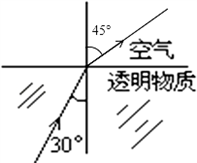 光从某种透明的物体射入空气,已知入射角为30°,折射角与入射角两者相差15°,请你画出它的折射光线,并把折射角的度数标在图上.