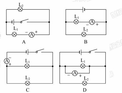 A. A图中电流表和灯L1串联,测的是灯L1中的电流,A对;B图中电流表的正负接线柱接反了,B错;C图中电流表测的是两灯电流的和,C错;D图中电流表并联在所测电流两端,把灯L1短路了,D错.