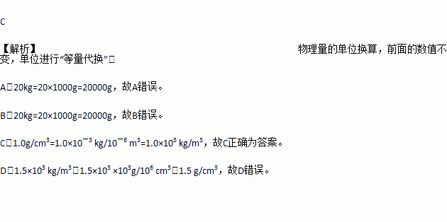 D. 1.5×103 kg/m3=1.5×103 g/106 cm3=1.5×10-3 g/cm3