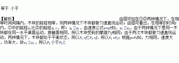 如图甲所示,纸带穿过打点计时器(每隔一定时间在纸带上打下一个点)与一木块左端相连,木块在弹簧测力计作用下沿水平桌面(纸面)向右运动时,就能在纸带上打出一系列的点。图乙中①和②是打点计时器先后打出的两条纸带,与其对应的测力计的示数分别为F1、F2,测力计对木块做功的功率分别为P1、P2,则F1___F2,P1____ P2(选填“大于”、“等于”或“小于”)。
