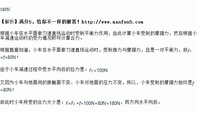 一位同学在超市购物时,用80N的水平力推着一辆小车在水平地面上做匀速直线运动。突然,该同学发现前面有一小孩,她马上用100N的水平力向后拉小车,使小车减速,在减速运动的过程中,求小车所受的合力.