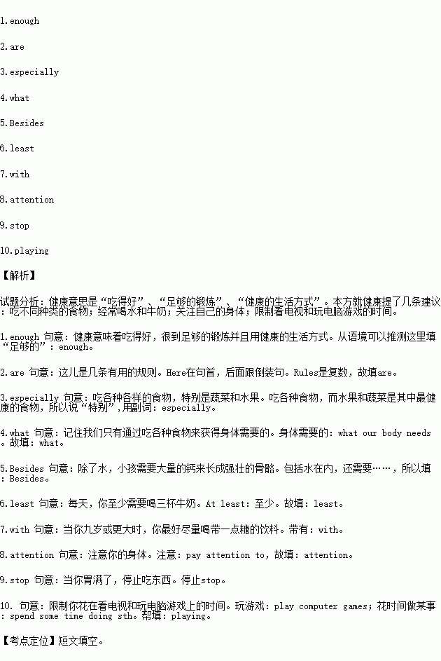 ★ Drink water and milk most often. Everyone knows that water is important. B 5. water, kids also need plenty of calcium (钙) to grow strong bones, which is rich in milk. Every day, you should drink at l 6. three cups of milk, when you are 9 years old or older. You’d better try to have drinks w 7. little sugar.
