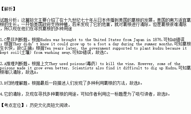 In the 1920s, people used the vine to feed farm animals. Ten years later, the government supported to plant kudzu because it kept soil(土壤) from washing away. However, by the 1950s, the government no longer wanted people to plant the vine. Twenty years after that, the government said it was a harmful plant.