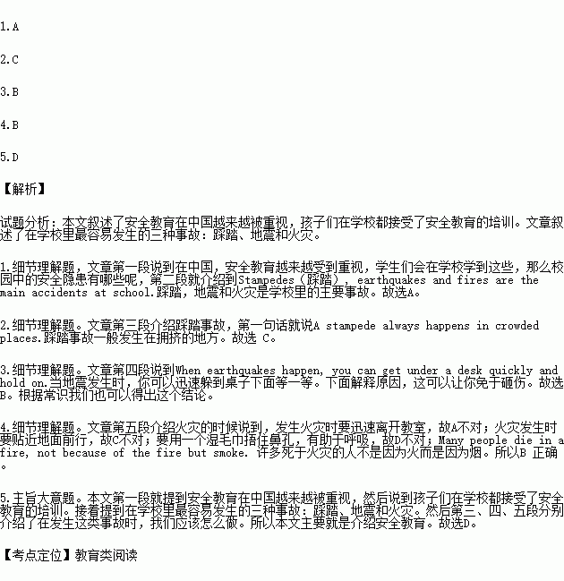 Stampedes(踩踏), earthquakes and fires are the main accidents at school.