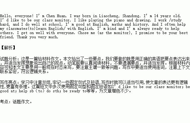 假设你是陈欢,你想竞选你们班的班长, 请根据下面表格的内容,写一篇介绍自己的演讲稿,为自己“拉票”。